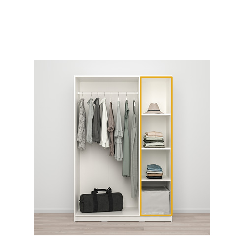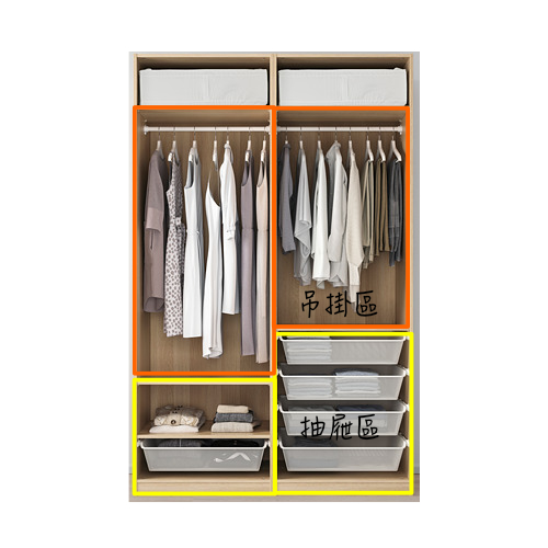 針對衣櫃層架較高的部分(下圖橘框處),選擇相對應尺寸的抽屜做堆疊,抽屜透明可以清楚辨識內容物,不僅方便也可以充分使用到此處的空間。