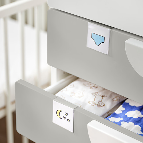 抽屜外側可以扣上標籤,方便父母或未來孩子可以自行辨識內容物並拿取衣物。
