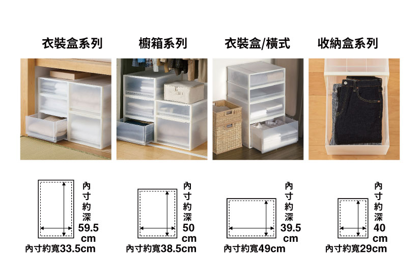 主要收納一般日常上衣、褲裝、連身/包屁衣、內褲、襪子等等可以折疊的衣物。