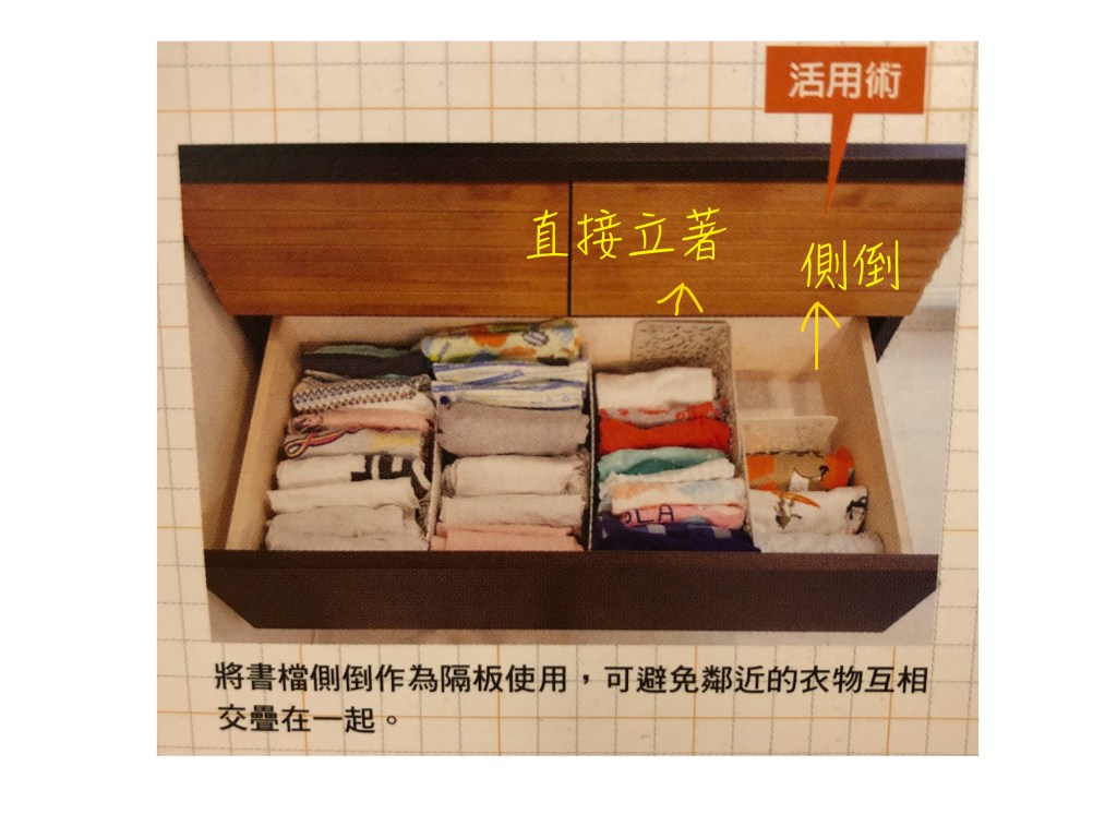 如果找不到合適尺寸的分隔收納盒,也可以如同小西紗代的著作『紗代流無印收納哲學』中的方法,使用書擋來協助收納。書檔可以針對衣櫃抽屜高度選擇側放或直接放置(如下圖)。未來若抽屜不需要分隔時,也可以拿來做一般書檔用,非常方便。
