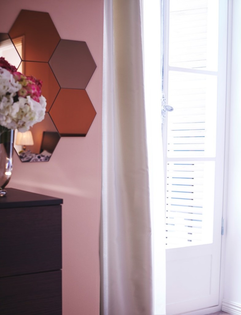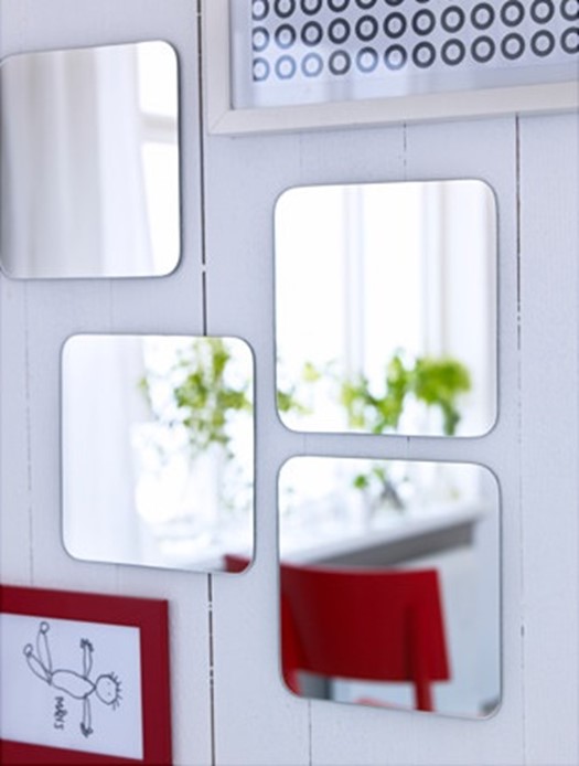 若是不想釘牆,可選擇黏貼式的鏡子,還可依照玄關牆面空間自行設計鏡子的排列方式,方便又實用。