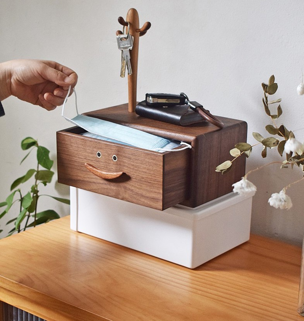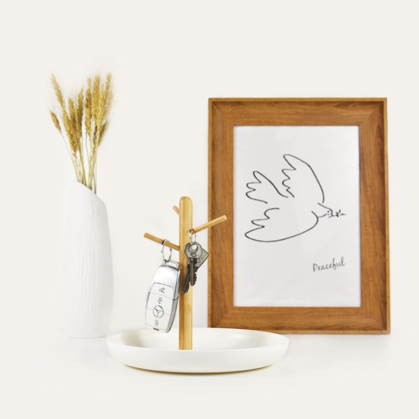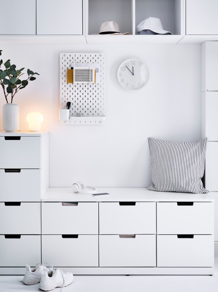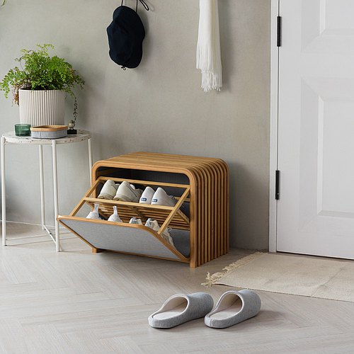 鑰匙、購物袋、口罩、消毒用品等…進出家門會順手拿取及擺放的小物,若是隨處擺放也沒有固定放置的位置,就會讓整個玄關櫃非常雜亂。建議可以擺放幾個專門收納小物的收納盒或收納盤,將雜物固定位置擺放,就能改善空間的雜亂感。