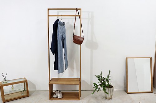 若玄關沒有設計系統式收納櫃放置衣物,可挑選有質感的衣帽架做擺放,增加收納空間。換鞋凳也可以選擇有收納功能的或是與衣帽架結合的款式。