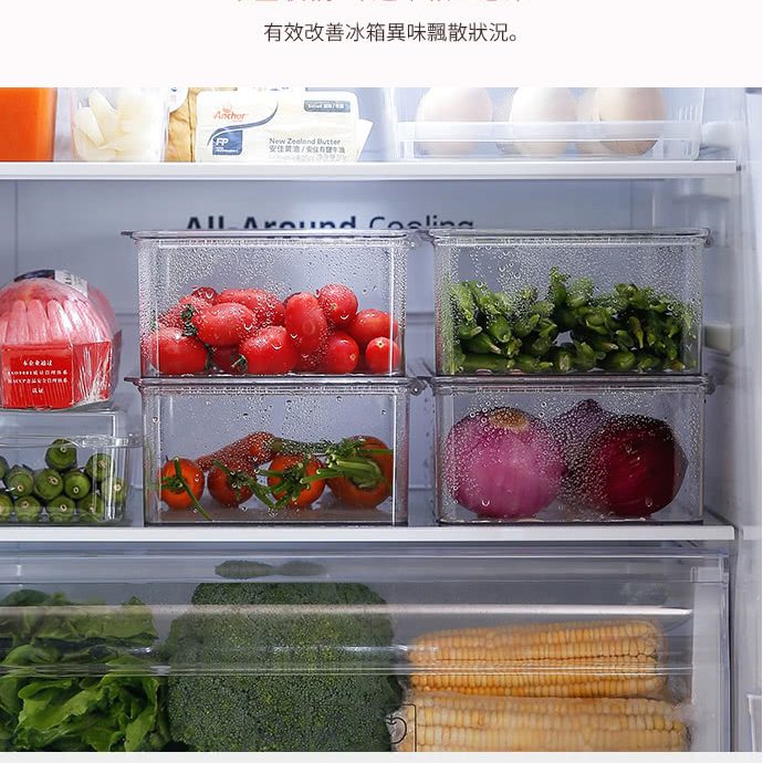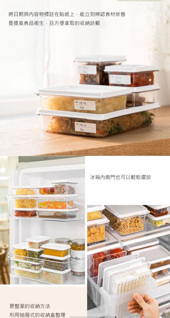 收納容器能讓食品整齊放於冰箱各層。如果有剩菜剩飯也不要使用原本的菜盤直接放到冰箱,建議改分裝放在安全材質的保鮮盒,乾淨又衛生。