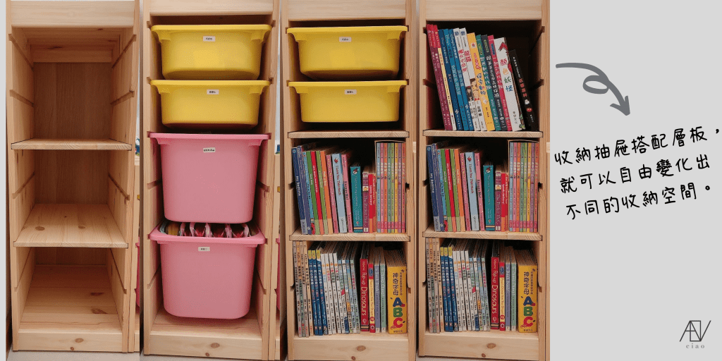 説到收納兒童用品,最重要的就是先選擇一個適合的收納家具,而IKEA的收納櫃我覺得CP值非常高,價錢不會太貴,且選擇不同的配件就能夠自由變換收納方式,更結合了成長型家具的特色,可說是一櫃多用!